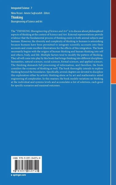 The "THINKING: Bioengineering of Science and Art" is to discuss about philosophical aspects of thinking at the context of Science and Art. External representations provide evidence that the fundamental process of thinking exists in both animal subjects and humans. However, the diversity and complexity of thinking in humans is astonishing because humans have been permitted to integrate scientific accounts into their accounts and create excellent illustrations for the effects of this integration. The book necessarily begins with the origins of human thinking and human thinking into self and others, body, and life. Multiple factors tend to modify the pattern of thinking. They all will come into play by this book that brings thinking into different disciplines: humanities, natural sciences, social sciences, formal sciences, and applied sciences. The thinking demands full processing of information, and therefore, the book considers the economy of thinking as well. The book thoroughly intends to explore thinking beyond the boundaries. Specifically, several chapters are devoted to discipline this exploration either by artistic thinking alone or by art and mathematics-aided engineering of complexities. In this manner, the book models variations on thinking at the individual and systems levels and accumulates a list of solutions, each good for specific scenarios and maximal outcomes.
