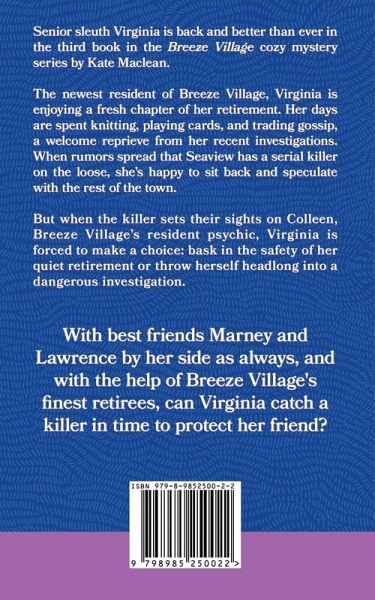 Senior sleuth Virginia is back and better than ever in the third book in the Breeze Village cozy mystery series by Kate Maclean. The newest resident of Breeze Village, Virginia is enjoying a fresh chapter of her retirement. Her days are spent knitting, playing cards, and trading gossip, a welcome reprieve from her recent investigations. When rumors spread that Seaview has a serial killer on the loose, she's happy to sit back and speculate with the rest of the town. But when the killer sets their sights on Colleen, Breeze Village's resident psychic, Virginia is forced to make a choice: bask in the safety of her quiet retirement or throw herself headlong into a dangerous investigation. With best friends Marney and Lawrence by her side as always, and with the help of Breeze Village's finest retirees, can Virginia catch a killer in time to protect her friend?