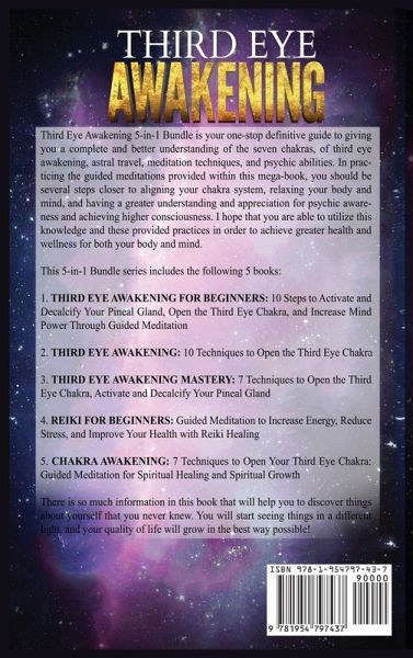 Third Eye Awakening is your one-stop definitive guide to giving you a complete and better understanding of the seven chakras, of third eye awakening, astral travel, meditation techniques, and psychic abilities. In practicing the guided meditations provided within this book, you'll be several steps closer to aligning your chakra system, relaxing your body and mind, and having a greater understanding and appreciation for psychic awareness and achieving higher consciousness. I hope that you are able to utilize this knowledge and these provided practices in order to achieve greater health and wellness for both your body and mind, as well as learning to master the ability to open your third eye... This five-in-one series includes the following 5 books: 1. THIRD EYE AWAKENING FOR BEGINNERS: 10 Steps to Activate and Decalcify Your Pineal Gland, Open the Third Eye Chakra, and Increase Mind Power Through Guided Meditation (Book 1) 2. THIRD EYE AWAKENING: 10 Techniques to Open the Third Eye Chakra (Book 2) 3. THIRD EYE AWAKENING MASTERY: 7 Techniques to Open the Third Eye Chakra, Activate and Decalcify Your Pineal Gland (Book 3) 4. REIKI FOR BEGINNERS: Guided Meditation to Increase Energy, Reduce Stress, and Improve Your Health with Reiki Healing (Book 4) 5. CHAKRA AWAKENING: 7 Techniques to Open Your Third Eye Chakra: Guided Meditation for Spiritual Healing and Spiritual Growth (Book 5) In this book you'll learn: What is the Third Eye? How to awaken your Third Eye Awaken your higher self through guided meditation Trusting your intuition Heal your mind and body through energy healing Chakra awakening and meditation Heal affected chakras and realign your entire chakra system Reenergize your body and mind Train your mind to invest in positive thoughts Lower stress levels and reduce anxiety Clear your body of negative energy Use the power of your mind to heal from within Gain wisdom and clarity from your divine self And so much more! This book will change your life and free yourself from negative energies. NOW is the time to make a change and live a happier life! Grab your copy of Third Eye Awakening now!