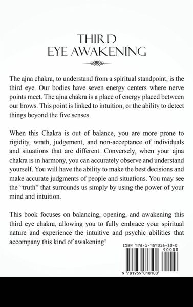 THIRD EYE AWAKENING The ajna chakra, to understand from a spiritual standpoint, is the third eye. Our bodies have seven energy centers where nerve points meet. The ajna chakra is a place of energy placed between our brows. This point is linked to intuition, or the ability to detect things beyond the five senses. When this Chakra is out of balance, you are more prone to rigidity, wrath, judgement, and non-acceptance of individuals and situations that are different. Conversely, when your ajna chakra is in harmony, you can accurately observe and understand yourself. You will have the ability to make the best decisions and make accurate judgments of people and situations. You may see the "truth" that surrounds us simply by using the power of your mind and intuition. This book focuses on balancing, opening, and awakening this third eye chakra, allowing you to fully embrace your spiritual nature and experience the intuitive and psychic abilities that accompany this kind of awakening!