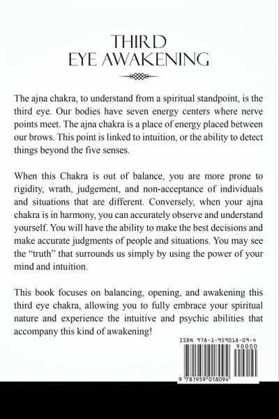THIRD EYE AWAKENING The ajna chakra, to understand from a spiritual standpoint, is the third eye. Our bodies have seven energy centers where nerve points meet. The ajna chakra is a place of energy placed between our brows. This point is linked to intuition, or the ability to detect things beyond the five senses. When this Chakra is out of balance, you are more prone to rigidity, wrath, judgement, and non-acceptance of individuals and situations that are different. Conversely, when your ajna chakra is in harmony, you can accurately observe and understand yourself. You will have the ability to make the best decisions and make accurate judgments of people and situations. You may see the "truth" that surrounds us simply by using the power of your mind and intuition. This book focuses on balancing, opening, and awakening this third eye chakra, allowing you to fully embrace your spiritual nature and experience the intuitive and psychic abilities that accompany this kind of awakening!