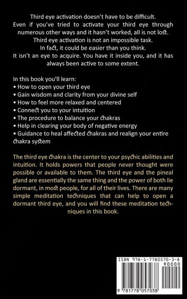 Third eye activation doesn't have to be difficult. Even if you've tried to activate your third eye through numerous other ways and it hasn't worked, all is not lost. Third eye activation is not an impossible task. In fact, it could be easier than you think. It isn't an eye to acquire. You have it inside you, and it has always been active to some extent. In this book you'll learn:How to open your third eye Gain wisdom and clarity from your divine self How to feel more relaxed and centered Connect you to your intuition The procedure to balance your chakras Help in clearing your body of negative energy Guidance to heal affected chakras and realign your entire chakra system The third eye chakra is the center to your psychic abilities and intuition. It holds powers that people never thought were possible or available to them. The third eye and the pineal gland are essentially the same thing and the power of both lie dormant, in most people, for all of their lives. There are many simple meditation techniques that can help to open a dormant third eye, and you will find these meditation techniques in this book.