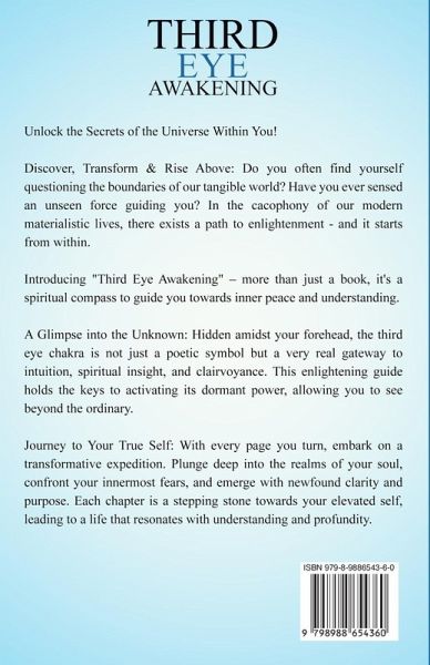 ¿¿¿¿ Unlock the Secrets of the Universe Within You! ¿¿¿¿ Discover, Transform & Rise Above: Do you often find yourself questioning the boundaries of our tangible world? Have you ever sensed an unseen force guiding you? In the cacophony of our modern materialistic lives, there exists a path to enlightenment - and it starts from within. ¿¿¿¿ Introducing "Third Eye Awakening" - more than just a book, it's a spiritual compass to guide you towards inner peace and understanding. ¿¿¿¿ ¿¿¿¿ A Glimpse into the Unknown: Hidden amidst your forehead, the third eye chakra is not just a poetic symbol but a very real gateway to intuition, spiritual insight, and clairvoyance. This enlightening guide holds the keys to activating its dormant power, allowing you to see beyond the ordinary. ¿¿¿¿ Journey to Your True Self: With every page you turn, embark on a transformative expedition. Plunge deep into the realms of your soul, confront your innermost fears, and emerge with newfound clarity and purpose. Each chapter is a stepping stone towards your elevated self, leading to a life that resonates with understanding and profundity. ¿¿¿¿ The Bigger Picture: When you align with the universe, your consciousness expands, revealing secrets of existence previously unknown. This book is not just an introduction but an immersive experience, carefully crafted to shift your paradigm. ¿ Why Choose "Third Eye Awakening"?: - Crystal Clear Guidance: Demystify the age-old lore of chakras and understand their undeniable influence on your mental, emotional, and spiritual well-being. - Enhanced Intuition: Harness the power to tap into a reservoir of wisdom, sensing and interacting with energies in a manner you never thought possible. - Mindful Living: Transcend the mundane and live with heightened awareness, forging a deeper connection with every living moment. ¿¿¿¿ Bonus Insights: Dive into curated meditation techniques and daily practices to kickstart your third eye awakening journey. Perfect for both beginners and spiritual aficionados. ¿¿¿¿ A Universal Calling: This is not just another book. It's an invitation from the universe itself. A call to recognize your potential, to see the unseen, to feel the unfelt. An urging to understand that there's more to life than just existing. ¿¿¿¿¿ Don't Wait Any Longer! Ignite your spiritual transformation today. Step into a realm of higher consciousness, intuition, and unparalleled clarity with "Third Eye Awakening."