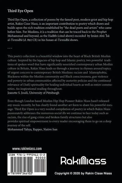 Third Eye Open' is a poetry book in it's purest form. Not being content with entertaining the reader, this offering from Rakin Niass transverse many genres and many realities to offer us an insight into being an intersectional Muslim. Although Intersectionality is a term often reserved for the narratives of women, 'Third Eye Open' reminds us why stories and experiences of masculinity, race and religion should not be side-lined and are more relevant now than they ever have been. Tanya Muneera Williams