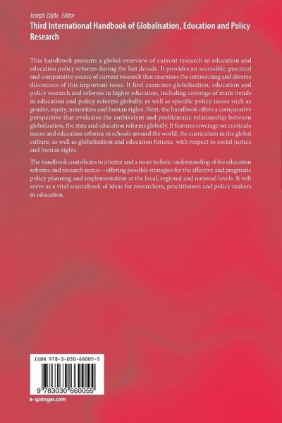 This handbook presents a global overview of current research in education and education policy reforms during the last decade. It provides an accessible, practical and comparative source of current research that examines the intersecting and diverse discourses of this important issue. It first examines globalisation, education and policy research and reforms in higher education, including coverage of main trends in education and policy reforms globally, as well as specific policy issues such as gender, equity, minorities and human rights. Next, the handbook offers a comparative perspective that evaluates the ambivalent and problematic relationship between globalisation, the state and education reforms globally. It features coverage on curricula issues and education reforms in schools around the world, the curriculum in the global culture, as well as globalisation and education futures, with respect to social justice and human rights.