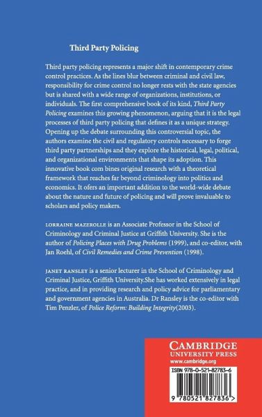 Third party policing represents a major shift in contemporary crime control practices. As the lines blur between criminal and civil law, responsibility for crime control no longer rests with state agencies but is shared between a wide range of organisations, institutions or individuals. The first comprehensive book of its kind, Third Party Policing examines this growing phenomenon, arguing that it is the legal basis of third party policing that defines it as a unique strategy. Opening up the debate surrounding this controversial topic, the authors examine civil and regulatory controls necessary to this strategy and explore the historical, legal, political and organizational environment that shape its adoption. This innovative book combines original research with a theoretical framework that reaches far beyond criminology into politics and economics. It offers an important addition to the world-wide debate about the nature and future of policing and will prove invaluable to scholars and policy makers.