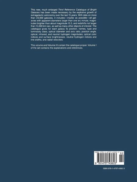 This second volume of RC3 includes data for galaxies between Oh and 12h. For convenience, we repeat the explanation of the catalogue entries below. Details of the reduction procedures, and Notes, References, and Appendices are in Volume 1. 2. The Catalogue The data for each galaxy are found on four successive lines on a single page. The entries are as follows: Column 1: Positions Line 1: RA and DEC = right ascension and declination for the equinox 2000.0, precessed from the 1950.0 position in Column 1, Line 4, given to 0.1 second of time and 1 aresec when available, and to 0.1 minute of time and 1 arcmin otherwise (Section 3.l.a). Line 2: I and b = galactic longitude and latitude in the lAU 1958 system (Blaauw et al. 1960); both to 0?01. Line 3: SGL and SGB = supergaladie longitude and latitude in the RC2 system (Section 3.l.b), both to 0?01. Line 4: RA and DEC = right ascension and declination for the equinox 1950.0 (Sec tion 3.l.a). Column 2: Names = commonly used designations for the galaxies (Section 3.2). Line 1: Names ( e.g., LMC, SMC) or NGC and IC designations. Line 2: UGC (Nilson 1973), ESO (Lauberts 1982), MCG (Vorontsov-Velyaminov et al. 1962-1974), UGCA (Nilson 1974), and CGCG (Zwicky et al. 1961-1968) des ignations, given in that order of preference. MCG designations not listed here are given in UGC and ESO.