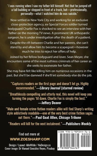 "I highly recommend this series!" Ian Rankin 'I was running when I saw my father kill himself. Not that he jumped off a tall building or stepped in front of a truck, but-professionally, personally-what I watched him do was suicide.' Now settled in New York City and working for an exclusive close-protection agency, ex-Special Forces soldier turned bodyguard Charlie Fox is shocked to see an interview with her father on the morning TV news. A prominent UK orthopaedic surgeon, he is under investigation after the death of a patient. Despite the rift between Charlie and her parents, she can't stand by and allow him to become a scapegoat, however much he tries to reject her offers of help. Joined by her fellow bodyguard and lover, Sean Meyer, she encounters some of the most ruthless criminals of her career as she seeks to exonerate her father. She may have felt like killing him on numerous occasions in the past. But she'll be damned if she'll let somebody else do the job. If you like Lee Child but have been looking for strong yet believable female protagonists, who will take down the bad guys without hesitation but who are still human enough to care, then bodyguard Charlie Fox is definitely for you. Readers have found books in this series action-packed thrill rides that kept them glued to the end, well-written, gritty, and hard to put down. A real page-turner. Author's Note: This is Book #7 in the Charlie Fox series. Although I've tried hard to make each of the stories stand alone, inevitably Charlie's history builds up over the course of the novels. If you are new to the series and want to know the full story of Charlie-how she began working with Sean Meyer after their time in the Army-then start at the beginning. If you're more interested in Charlie's career as a close-protection operative, then I'd recommend you begin with Book #4, FIRST DROP, when she and her teenage charge find themselves on the run during her first bodyguard job in Florida.