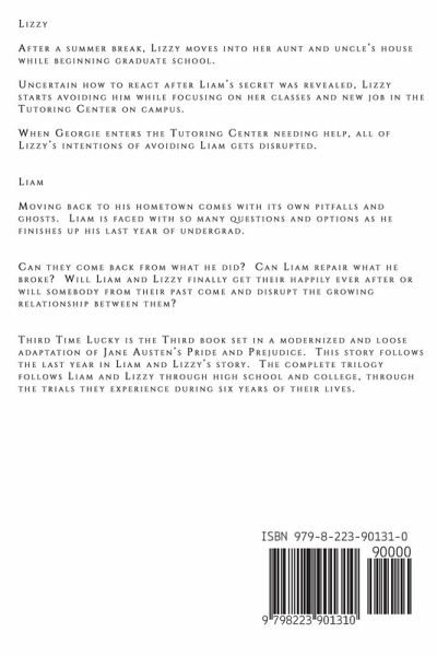 Lizzy After a summer break, Lizzy moves into her aunt and uncle's house while beginning graduate school. Uncertain how to react after Liam's secret was revealed, Lizzy starts avoiding him while focusing on her classes and new job in the Tutoring Center on campus. When Georgie enters the Tutoring Center needing help, all of Lizzy's intentions of avoiding Liam gets disrupted. Liam Moving back to his hometown comes with its own pitfalls and ghosts. Liam is faced with so many questions and options as he finishes up his last year of undergrad. Can they come back from what he did? Can Liam repair what he broke? Will Liam and Lizzy finally get their happily ever after or will somebody from their past come and disrupt the growing relationship between them? Third Time Lucky is the Third book set in a modernized and loose adaptation of Jane Austen's Pride and Prejudice. This story follows the last year in Liam and Lizzy's story. The complete trilogy follows Liam and Lizzy through high school and college, through the trials they experience during six years of their lives.