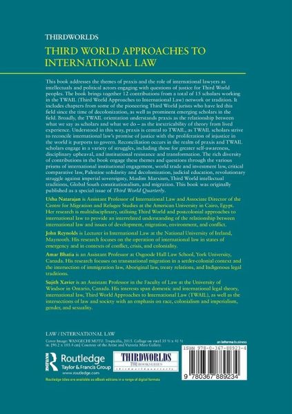 This book addresses the themes of praxis and the role of international lawyers as intellectuals and political actors engaging with questions of justice for Third World peoples. The book brings together 12 contributions from a total of 15 scholars working in the TWAIL (Third World Approaches to International Law) network or tradition. It includes chapters from some of the pioneering Third World jurists who have led this field since the time of decolonization, as well as prominent emerging scholars in the field. Broadly, the TWAIL orientation understands praxis as the relationship between what we say as scholars and what we do - as the inextricability of theory from lived experience. Understood in this way, praxis is central to TWAIL, as TWAIL scholars strive to reconcile international law's promise of justice with the proliferation of injustice in the world it purports to govern. Reconciliation occurs in the realm of praxis and TWAIL scholars engage in a variety of struggles, including those for greater self-awareness, disciplinary upheaval, and institutional resistance and transformation. The rich diversity of contributions in the book engage these themes and questions through the various prisms of international institutional engagement, world trade and investment law, critical comparative law, Palestine solidarity and decolonization, judicial education, revolutionary struggle against imperial sovereignty, Muslim Marxism, Third World intellectual traditions, Global South constitutionalism, and migration. This book was originally published as a special issue of Third World Quarterly.