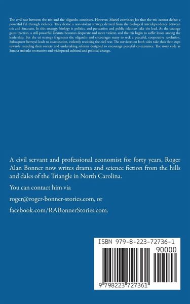 The civil war between the tris and the oligarchs continues. However, Muriel convinces Jot that the tris cannot defeat a powerful Fel through violence. They devise a non-violent strategy derived from the biological interdependence between tris and Suranans. In this strategy, biology is politics, and persuasion and public relations take the lead. As the strategy gains traction, a still-powerful Destuta becomes desperate and more violent, and the tris begin to suffer losses among the leadership. But the tri strategy fragments the oligarchs and encourages many to seek a peaceful, cooperative…mehr