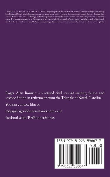 THIRDS is the first of THE NEBULA TALES, a space opera at the juncture of political science, biology, and fantasy. Reaching the Orion Nebula, humans encounter a space-faring society - Surana. Suranans are tri-sexual: there are three genders - males, females, and tris. The biology and interdependence among the three Suranan sexes result in pervasive and deeply seated discrimination against tris. Consequently, tris are excluded from much of polite society and therefore live lives which are often short, brutal, and miserable. On Surana, biology drives politics, violence descends, and Surana threatens to explode.
