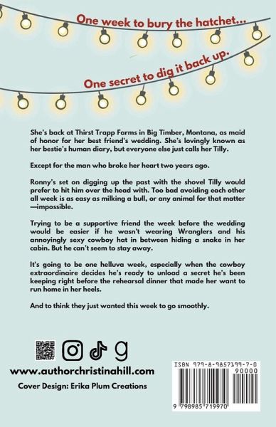 She's back at Thirst Trapp Farms in Big Timber, Montana, as maid of honor for her best friend's wedding. She's lovingly known as her bestie's human diary, but everyone else just calls her Tilly. Except for the man who broke her heart two years ago. Ronny's set on digging up the past with the shovel Tilly would prefer to hit him over the head with. Too bad avoiding each other all week is as easy as milking a bull, or any animal for that matter-impossible. Trying to be a supportive friend the week before the wedding would be easier if he wasn't wearing Wranglers and his annoyingly sexy cowboy hat in between hiding a snake in her cabin. But he can't seem to stay away. It's going to be one helluva week, especially when the cowboy extraordinaire decides he's ready to unload a secret he's been keeping right before the rehearsal dinner that made her want to run home in her heels. And to think they just wanted this week to go smoothly.