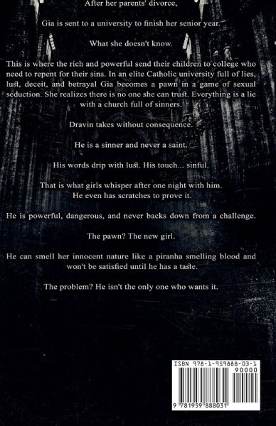 Dravin takes without consequence. He is a sinner and never a saint. His words drip with lust. His touch... sinful. That is what girls whisper after one night with him. He even has the scratches to prove it. He is powerful, dangerous, and never backs down from a challenge. The pawn? The new girl. He can smell her innocent nature like a piranha smelling blood and won't be satisfied until he has a taste. The problem? He isn't the only one who wants it. In an elite Catholic university full of lies, lust, deceit, and betrayal Gia becomes a pawn in a game of sexual seduction. She realizes there is no one she can trust. Everything is a lie with a church full of sinners. Dravin knows exactly what he wants though, and he won't stop until she belongs to him.