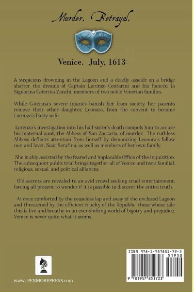 Venice, July, 1613: A suspicious drowning in the Lagoon and a deadly assault on a bridge shatter the dreams of Captain Lorenzo Contarini and his fiancée, la Signorina Caterina Zanchi, members of two noble Venetian families. While Caterina's severe injuries banish her from society, her parents remove their other daughter, Leonora, from the convent to become Lorenzo's hasty wife. Lorenzo's investigation into his half-sister's death compels him to accuse his maternal aunt, the Abbess of San Zaccaria, of murder. The ruthless Abbess deflects attention from herself by demonizing Leonora's fellow nun and lover, Suor Serafina, as well as members of her own family. She is ably assisted by the feared and implacable Office of the Inquisition. The subsequent public trial brings together all of Venice and tests familial, religious, sexual, and political alliances. Old secrets are revealed to an avid crowd seeking cruel entertainment, forcing all present to wonder if it is possible to discover the entire truth. At once comforted by the ceaseless lap and sway of the enclosed Lagoon and threatened by the efficient cruelty of the Republic, those whose tale this is live and breathe in an ever-shifting world of bigotry and prejudice. Venice is never quite what it seems.