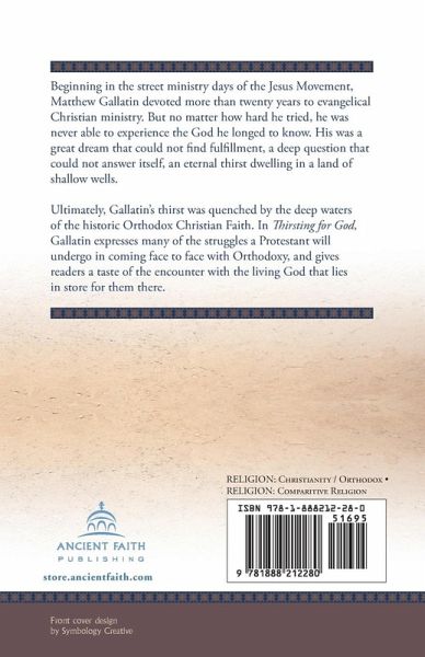 Beginning in the street ministry days of the Jesus Movement, Matthew Gallatin devoted more than twenty years to evangelical Christian ministry. But no matter how hard he tried, he was never able to experience the God he longed to know. His was a great dream that could not find fulfillment, a deep question that could not answer itself, an eternal thirst dwelling in a land of shallow wells. Ultimately, Gallatin's thirst was quenched by the deep waters of the historic Orthodox Christian Faith. In Thirsting for God, Gallatin expresses many of the struggles a Protestant will undergo in coming face to face with Orthodoxy, and gives readers a taste of the encounter with the living God that lies in store for them there.