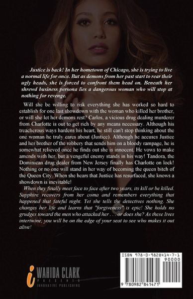 Justice is back! In her hometown of Chicago, she is trying to live a normal life for once. But as demons from her past start to rear their ugly heads, she is forced to confront them head on. Beneath her shrewd business persona lies a dangerous woman who will stop at nothing for revenge. Will she be willing to risk everything she has worked so hard to establish for one last showdown with the woman who killed her brother, or will she let her demons rest? Carlos, a vicious drug dealing murderer from Charlotte is out to get rich by any means necessary. Although his treacherous ways hardens his heart, he still can't stop thinking about the one woman he truly cares about (Justice). Although he accuses Justice and her brother of the robbery that sends him on a bloody rampage, he is somewhat relieved once he finds out she is innocent. He vows to make amends with her, but a vengeful enemy stands in his way! Tandora, the Dominican drug dealer from New Jersey finally has Charlotte on lock! Nothing or no one will stand in her way of becoming the queen bitch of the Queen City. When she hears that Justice has resurfaced, she knows a showdown is inevitable! When they finally meet face to face after two years, its kill or be killed. Sapphire recovers from her coma and remembers everything that happened that fateful night. Yet she tells the detectives nothing. She changes her life and learns that "forgiveness" is epic! She holds no grudges toward the men who attacked her . . . or does she? As these lives intertwine, you will be on the edge of your seat to see who makes it out alive!