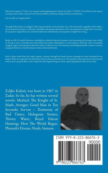 This book comprises 17 short, very unusual, and intriguing stories. Stories are told in a "CRAZY" way. However, the unitary seeming craziness hides real and severe human problems and shortcomings of human communities. Are you able to recognize them?