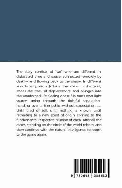 The story consists of "we" who are different in dislocated time and space, connected remotely by destiny and flowing back to the shape. In different simultaneity, each follows the voice in the void, traces the track of displacement, and plunges into the unadorned life. Seeing oneself in one's own light source, going through the rightful separation, handing over a friendship without expectation ...... Until tired of self, until nothing is known, until retreating to a new point of origin, coming to the fundamental respective reunion of each. After all the ashes, standing on the circle of the world reborn, and then continue with the natural intelligence to return to the game again. The plot of the characters is assembled from the author's own real construction of the overlap between dreams and reality, and the entity of consciousness and virtual reality are connected as one, just because they are one. The dialogue between "being" and "not being" and the performance of different dimensions under the surface are recorded.
