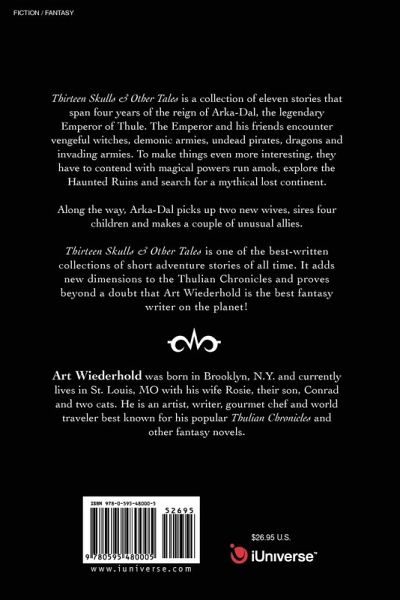 Thirteen Skulls & Other Tales is a collection of eleven stories that span four years of the reign of Arka-Dal, the legendary Emperor of Thule. The Emperor and his friends encounter vengeful witches, demonic armies, undead pirates, dragons and invading armies. To make things even more interesting, they have to contend with magical powers run amok, explore the Haunted Ruins and search for a mythical lost continent. Along the way, Arka-Dal picks up two new wives, sires four children and makes a couple of unusual allies. Thirteen Skulls & Other Tales is one of the best-written collections of short adventure stories of all time. It adds new dimensions to the Thulian Chronicles and proves beyond a doubt that Art Wiederhold is the best fantasy writer on the planet!