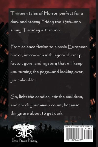 Thirteen tales of Horror, perfect for a dark and stormy Friday the 13th...or a sunny Tuesday afternoon. From science fiction to classic European horror, interwoven with layers of creep factor, gore, and mystery that will keep you turning the page...and looking over your shoulder. So, light the candles, stir the cauldron, and check your ammo count, because things are about to get dark! With stories by Christopher Woods, Dan Bridgwater, H.Y. Gregor, Kevin Ikenberry, Marie Whittaker, Mark Wandrey, Rob Howell, Matt Novotny, Nick Steverson, Melissa Olthoff, Marisa Wolf, Kacey Ezell, Declan Finn, Steve Diamond, & DJ Butler