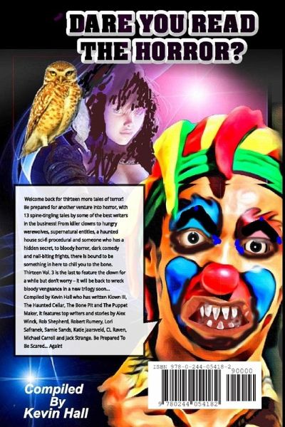 Welcome back for thirteen more tales of terror! Be prepared for another venture into horror, with 13 spine-tingling tales by some of the best writers in the business. From killer clowns to hungry werewolves, supernatural entities, a haunted house sci-fi procedural and someone who has a hidden secret, to bloody horror, dark comedy and nail-biting frights, there is bound to be something in here to chill you to the bone. Thirteen Vol. 3 is the last to feature the clown for a while, but don't worry - it will be back to wreck bloody vengeance in a new trilogy soon. Compiled by Kevin Hall, who has written Klown III, The Haunted Cellar, The Bone Pit and The Puppet Maker, it also features top writers and stories by Alex Winck, Rob Shepherd, Robert Rumery, Lori Safranek, Samie Sands, Katie Jaarsveld, CL Raven, Michael Carroll and Jack Strange. Be Prepared To Be Scared - Again!