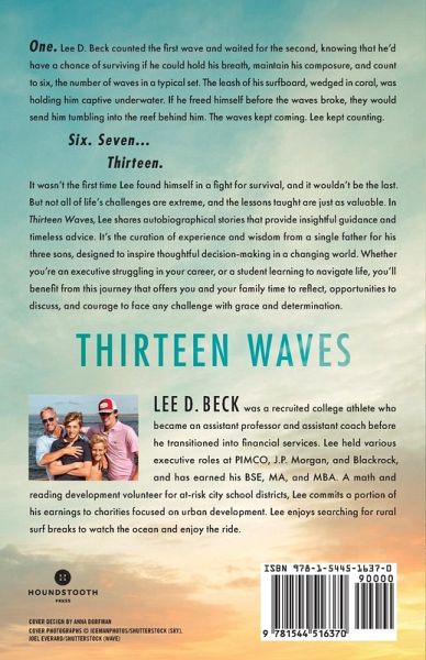 One. Lee D. Beck counted the first wave and waited for the second, knowing that he'd have a chance of surviving if he could hold his breath, maintain his composure, and count to six, the number of waves in a typical set. The leash of his surfboard, wedged in coral, was holding him captive underwater. If he freed himself before the waves broke, they would send him tumbling into the reef behind him. The waves kept coming. Lee kept counting. Six. Seven... Thirteen. It wasn't the first time Lee found himself in a fight for survival, and it wouldn't be the last. But not all of life's challenges are extreme, and the lessons taught are just as valuable. In Thirteen Waves, Lee shares autobiographical stories that provide insightful guidance and timeless advice. It's the curation of experience and wisdom from a single father for his three sons, designed to inspire thoughtful decision-making in a changing world. Whether you're an executive struggling in your career, or a student learning to navigate life, you'll benefit from this journey that offers you and your family time to reflect, opportunities to discuss, and courage to face any challenge with grace and determination.