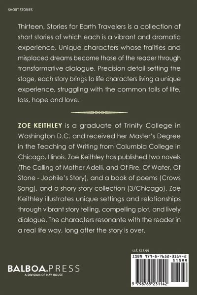 Thirteen, Stories for Earth Travelers is a collection of short stories of which each is a vibrant and dramatic experience. Unique characters whose frailties and misplaced dreams become those of the reader through transformative dialogue. Precision detail setting the stage, each story brings to life characters living a unique experience, struggling with the common toils of life, loss, hope and love.