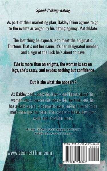 Speed-f*cking-dating. As part of their marketing plan, Oakley Orion agrees to go to the events arranged by his dating agency: MatchMate. The last thing he expects is to meet the enigmatic Thirteen. That's not her name, it's her designated number, and a sign of the luck he's about to have. Evie is more than an enigma. The woman is sex on legs. She's sassy, and exudes nothing but confidence. But is she what she appears? As Oakley peels back the layers and learns about the woman who's become his obsession, he finds out she has a dark secret, a traumatic past, and he'll need to be more than just her date if he wants to break down her walls and steal her heart. Warning: Contains explicit language and imagery. Suitable only for ages 18 and over.