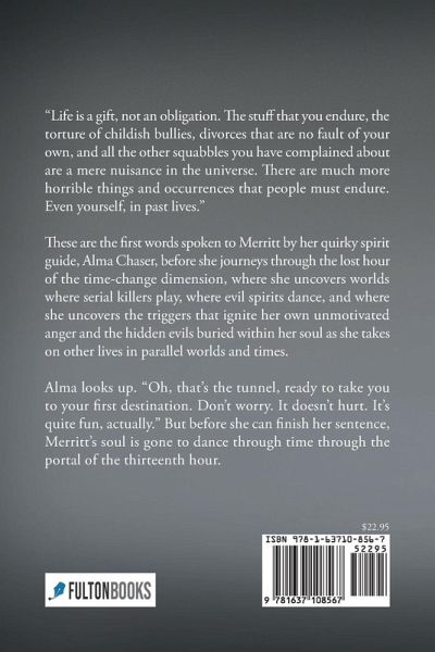 "Life is a gift, not an obligation. The stuff that you endure, the torture of childish bullies, divorces that are no fault of your own, and all the other squabbles you have complained about are a mere nuisance in the universe. There are much more horrible things and occurrences that people must endure. Even yourself, in past lives." These are the first words spoken to Merritt by her quirky spirit guide, Alma Chaser, before she journeys through the lost hour of the time-change dimension, where she uncovers worlds where serial killers play, where evil spirits dance, and where she uncovers the triggers that ignite her own unmotivated anger and the hidden evils buried within her soul as she takes on other lives in parallel worlds and times. Alma looks up. "Oh, that's the tunnel, ready to take you to your first destination. Don't worry. It doesn't hurt. It's quite fun, actually." But before she can finish her sentence, Merritt's soul is gone to dance through time through the portal of the thirteenth hour.