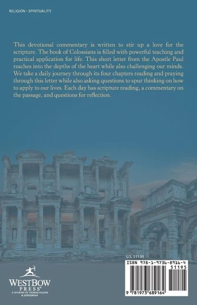 This devotional commentary is written to stir up a love for the scripture. The book of Colossians is filled with powerful teaching and practical application for life. This short letter from the Apostle Paul reaches into the depths of the heart while also challenging our minds. We take a daily journey through its four chapters reading and praying through this letter while also asking questions to spur thinking on how to apply to our lives. Each day has scripture reading, a commentary on the passage, and questions for reflection.