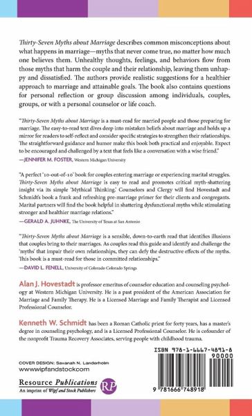 Thirty-Seven Myths about Marriage describes common misconceptions about what happens in marriage--myths that never come true, no matter how much one believes them. Unhealthy thoughts, feelings, and behaviors flow from those myths that harm the couple and their relationship, leaving them unhappy and dissatisfied. The authors provide realistic suggestions for a healthier approach to marriage and attainable goals. The book also contains questions for personal reflection or group discussion among individuals, couples, groups, or with a personal counselor or life coach.