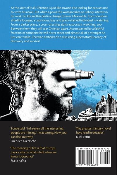 At the start of it all, Christian is just like anyone else looking for excuses not to write his novel. But when a powerful woman takes an unholy interest in his work, his life and his destiny change forever. Meanwhile, from countless afterlife lounges, a capricious, lazy and gravy-stained individual is watching. From a darker place, a cross-dressing alpha autocrat is watching, too. Between them they will tear Christian apart. Accompanied by a faithful fraction of someone he will never meet and almost all of a stranger he just can't shake, Christian embarks on a disturbing supernatural journey of discovery and survival.