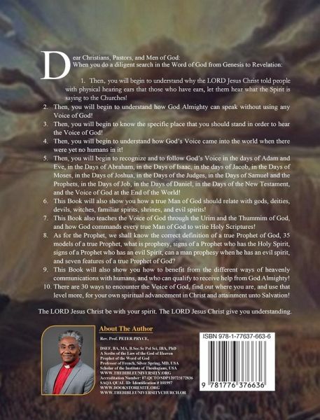 When you do a diligent search in the Word of God from Genesis to Revelation:Then, you will begin to understand why the LORD Jesus Christ told people with physical hearing ears that those who have ears, let them hear what the Spirit is saying to the Churches! Then, you will begin to understand how God Almighty can speak without using any Voice of God! Then, you will begin to know the specific place that you should stand in order to hear the Voice of God! Then, you will begin to understand how God's Voice came into the world when there were yet no humans in it! Then, you will begin to recognize and to follow God's Voice in the days of Adam and Eve, in the Days of Abraham, in the Days of Isaac, in the days of Jacob, in the Days of Moses, in the Days of Joshua, in the Days of the Judges, in the Days of Samuel and the Prophets, in the Days of Job, in the Days of Daniel, in the Days of the New Testament, and the Voice of God at the End of the World! This Book will also show you how a true Man of God should relate with gods, deities, devils, witches, familiar spirits, shrines, and evil spirits! This Book also teaches the Voice of God through the Urim and the Thummim of God, and how God commands every true Man of God to write Holy Scriptures! As for the Prophet, we shall know the correct definition of a true Prophet of God, 35 models of a true Prophet, what is prophesy, signs of a Prophet who has the Holy Spirit, signs of a Prophet who has an evil Spirit, can a man prophesy when he has an evil spirit, and seven features of a true Prophet of God? This Book will also show you how to benefit from the different ways of heavenly communications with humans, and who can qualify to receive help from God Almighty! There are 30 ways to encounter the Voice of God, find out where you are, and use that level more, for your own spiritual advancement in Christ and attainment unto Salvation! The LORD Jesus Christ be with your spirit. The LORD Jesus Christ give you understanding.Rev. Prof. PETER PRYCE,DSEF, BA, MA, B.Soc.Sc Pol Sci, IBA, PhDA Scribe of the Law of the God of HeavenProphet of the Word of God