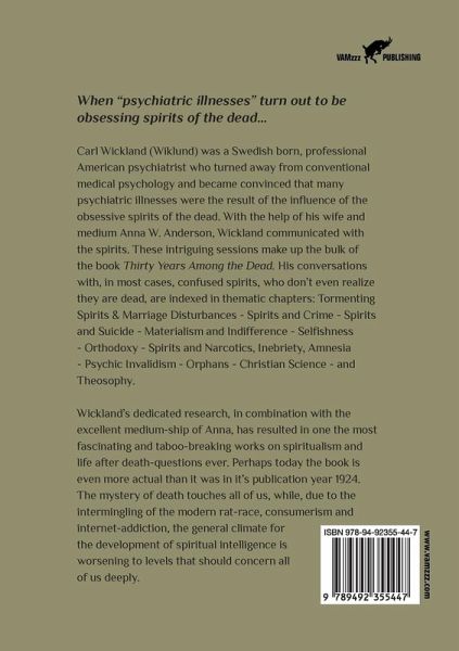 When "psychiatric illnesses" turn out to be obsessing spirits of the dead... Carl Wickland (Wiklund) was a Swedish born, professional American psychiatrist who turned away from conventional medical psychology and became convinced that many psychiatric illnesses were the result of the influence of the obsessive spirits of the dead. With the help of his wife and medium Anna W. Anderson, Wickland communicated with the spirits. These 82 intriguing sessions make up the bulk of the book Thirty Years Among the Dead. His conversations with, in most cases, confused spirits, who don't even realize they are dead, are indexed in thematic chapters: Tormenting Spirits & Marriage Disturbances - Spirits and Crime - Spirits and Suicide - Materialism and Indifference - Selfishness - Orthodoxy - Spirits and Narcotics, Inebriety, Amnesia - Psychic Invalidism - Orphans - Christian Science - and Theosophy. Wickland's dedicated research, in combination with the excellent medium-ship of Anna, has resulted in one the most fascinating and taboo-breaking works on spiritualism and life after death-questions ever. Perhaps today the book is even more actual than it was in it's publication year 1924. The mystery of death touches all of us, while, due to the intermingling of the modern rat-race, consumerism and internet-addiction, the general climate for the development of spiritual intelligence is worsening to levels that should concern all of us deeply. Post Scriptum with biography of the author is included.