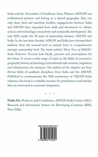 India and the Association of Southeast Asian Nations (ASEAN) are civilisational partners and belong to a shared geography. They not only share land and maritime borders, engagements between India and ASEAN have expanded from trade and investment to culture, science and technology, connectivity and sustainable development. The year 2022 marks the 30 years of partnership between ASEAN and India. In the last three decades, ASEAN and India have elevated their relations from the sectoral level to summit level to comprehensive strategic partnership level. The book entitled Thirty Years of ASEAN-India Relations: Towards Indo-Pacific, presents rich prescriptions for the future. It covers a wide range of topics in the fields of economics, geography, history, archaeology, international trade, tourism, migration, and infrastructure for transport. The authors of the chapters are from diverse fields of academic disciplines from India and the ASEAN. Published to commemorate the 30th anniversary of ASEAN-India relations, this book is a valuable resource for practitioners and scholars who are interested in economic integration.