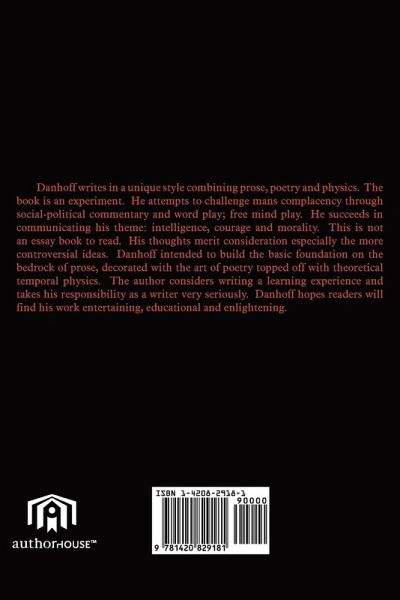 Danhoff writes in a unique style combining prose, poetry and physics. The book is an experiment. He attempts to challenge mans complacency through social-political commentary and word play; free mind play. He succeeds in communicating his theme: intelligence, courage and morality. This is not an essay book to read. His thoughts merit consideration especially the more controversial ideas. Danhoff intended to build the basic foundation on the bedrock of prose, decorated with the art of poetry topped off with theoretical temporal physics. The author considers writing a learning experience and takes his responsibility as a writer very seriously. Danhoff hopes readers will find his work entertaining, educational and enlightening.
