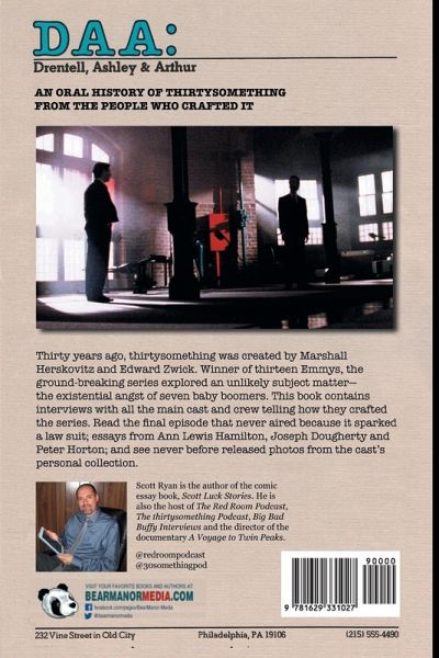Babyboomers in their thirties never possessed a collective voice until thirtysomething (1987-1991), a thirteen-time Emmy Award-winning series, captured the essence of their angst. Author Scott Ryan now gives the cast and crew their voice on the making of all 85 episodes. Revealing behind-the-scenes stories are recalled by Ken Olin, Timothy Busfield, Mel Harris, Melanie Mayron, Peter Horton, Patricia Wettig, Polly Draper, Brandy Alexander, Joseph Dougherty, Liberty Godshall, Jill Gordon, Paul Haggis, Ann Lewis Hamilton, Marshall Herskovitz, Winnie Holzman, Richard Kramer, Ron Lagomarsino, Ellen S. Pressman, Susan Shilliday, Scott Winant, Kenneth Zunder, Edward Zwick, and Marshall Herskovitz. They remember the episode plots, controversies, and fights with censors in revealing, no-holds-barred detail. Enjoy other remembrances from actors David Clennon, Dana Delany, Michael Feinstein, David Marshall Grant, Mel Harris, Patricia Kalember, Nick Meglin, Ken Olin, Corey Parker, Charlotte Stewart, Patricia Wettig, and Lenny Von Dohlen. Discover: · How the series was canceled, and how the creators decided to end the series without telling anyone, and read the originally scripted ending that was never produced. · A special section on directing. · An essay by actor Peter Horton (Gary). · An essay by a Mad magazine editor, who appeared in a cameo. · How Ken Olin and his real life wife, Patricia Wettig, managed to work together. · Writer Richard Kramer on writing the controversial "Strangers" episode. · Actors Timothy Busfield, Melanie Mayron, and Peter Horton on acting and learning to direct. Illustrated with over 150 rare photos, including original TV Guide ads, press pictures, and sets and props. Foreword by Emmy-nominated writer Ann Lewis Hamilton. Afterword by Emmy-winning writer, Joseph Dougherty. About the author: Scott Ryan is the author of Scott Luck Stories; host of the Red Room Podcast host of Big Bad Buffy Interviews; host of the thirtysomething podcast; writer and director of A Voyage To Twin Peaks; Managing Editor of The Blue Rose; contributor to Sondheim Review Magazine, Twin Peaks Fan Phenomena series, and Hot Valley Writers.