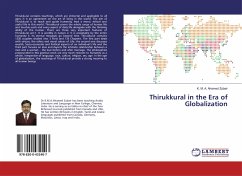 Thirukkural contains teachings, which are immortal and applicable to all ages. It is an agreement on the art of living in this world. The aim of Thirukkural is to teach and guide humanity, lead a moral, ethical and useful life in this world. Thirukkural covers the whole range of human life and touches each and every aspect of daily life alongside with the thinking ability of the human. There are three very important features of Thirukkural are:1. It is worldly in nature 2. It is acceptable by the entire humanity 3. Its eternal messages go beyond time. Thirukkural contains 1330 couplets divided into 3 Parts and 133 Chapters. The first part deals with virtues, the ethics and moral values of Life; the second one discusses wealth, Socio-economic and Political aspects of an individual's life and the third part focuses on love and depicts the intimate relationship between a man and a woman - the love before and after marriage. The philosophies propounded in this poetical work are very much relevant to humanity as a whole, irrespective of language, race, culture, religion, sex, age. In the age of globalization, the teachings of Thirukkural provide a strong mooring to all human beings
