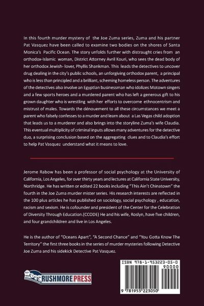 In this fourth murder mystery of the Joe Zuma series, Zuma and his partner Pat Vasquez have been called to examine two bodies on the shores of Santa Monica's Pacific Ocean. The story unfolds further with distraught cries from an orthodox-Islamic woman, District Attorney Avril Kouri, who sees the dead body of her orthodox Jewish- lover, Phyllis Shankman. This leads the detectives to uncover drug dealing in the city's public schools, an unforgiving orthodox parent, a principal who is less than principled and a brilliant, scheming homeless person. The adventures of the detectives also involve an Egyptian businessman who idolizes Motown singers and a few sports heroes and a murdered parent who has left a generous gift to his grown daughter who is wrestling with her efforts to overcome ethnocentrism and mistrust of males. Towards the dénouement to all these circumstances we meet a parent who falsely confesses to a murder and learn about a Las Vegas child adoption that leads us to a murderer and also brings into the storyline Zuma's wife Claudia. This eventual multiplicity of criminal inputs allows many adventures for the detective duo, a surprising conclusion based on the aggregating clues and to Claudia's effort to help Pat Vasquez understand what it means to love.