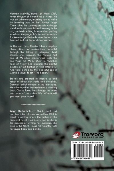 Herman Melville, author of Moby Dick, never thought of himself as a writer. He was an adventurer, learning how to write by learning how to live. Author Leigh Clark takes the same approach. Although she does have some formal training in the art, she feels writing is more than putting words on the page; it is instead a search for knowledge that enhances the way we live and look at the world around us. In This and That, Clarke takes everyday observations and makes them beautiful through the telling of eloquent short stories. She reinvents the famous first line of Melville's masterwork with the line "Call me Moby Dick" in "Another Point of View." She explores the painful process of job hunting in "The Interview." And take a stop by the peaceful sea in Clarke's visual feast, "The Beach." Stories are created to inspire us and teach us about our world and ourselves. Discover enlightenment in the everyday. Melville found his inspiration on a whaling boat. Clarke found hers through the twists and turns of an artist's life. Where will you meet your muse?