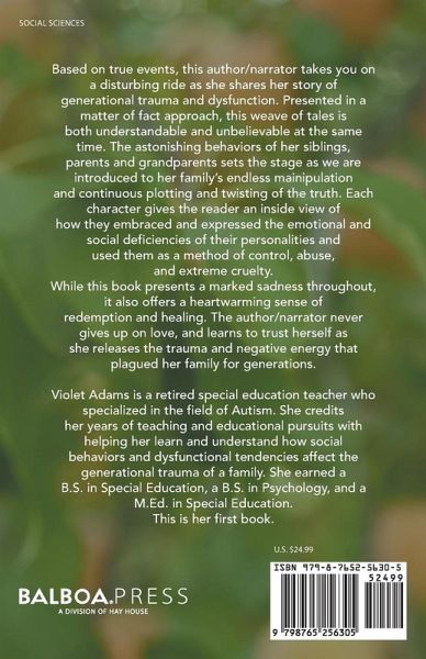 Based on true events, this author/narrator takes you on an disturbing ride as she shares her story of generational trauma and dysfunction. Presented in a matter of fact approach, this weave of tales is both understandable and unbelievable at the same time. The astonishing behaviors of her siblings, parents and grandparents sets the stage as we are introduced to her family's endless mainipulation and continuous plotting and twisting of the truth. Each character gives the reader an inside view of how they embraced and expressed the emotional and social deficiencies of their personalities and used them as a method of control, abuse, and extreme cruelty. While this book presents a marked sadness throughout, it also offers a heartwarming sense of redemption and healing. The author/narrator never gives up on love, and learns to trust herself as she releases the trauma and negative energy that plagued her family for generations.