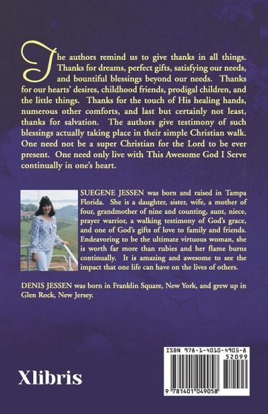 The authors remind us to give thanks in all things. Thanks for dreams, perfect gifts, satisfying our needs, and bountiful blessings beyond our needs. Thanks for our hearts' desires, childhood friends, prodigal children, and the little things. Thanks for the touch of His healing hands, numerous other comforts, and last but certainly not least, thanks for salvation. The authors give testimony of such blessings actually taking place in their simple Christian walk. One need not be a super Christian for the Lord to be ever present. One need only live with This Awesome God I Serve continually in one's heart.