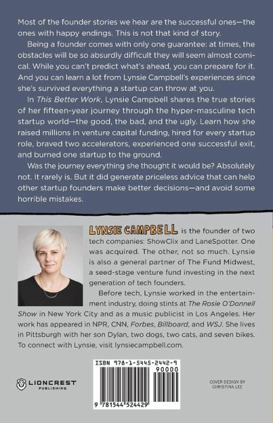 Most of the founder stories we hear are the successful ones-the ones with happy endings. This is not that kind of story. Being a founder comes with only one guarantee: at times, the obstacles will be so absurdly difficult they will seem almost comical. While you can't predict what's ahead, you can prepare for it. And you can learn a lot from Lynsie Campbell's experiences since she's survived everything a startup can throw at you. In This Better Work, Lynsie Campbell shares the true stories of her fifteen-year journey through the hyper-masculine tech startup world-the good, the bad, and the ugly. Learn how she raised millions in venture capital funding, hired for every startup role, braved two accelerators, experienced one successful exit, and burned one startup to the ground. Was the journey everything she thought it would be? Absolutely not. It rarely is. But it did generate priceless advice that can help other startup founders make better decisions-and avoid some horrible mistakes.