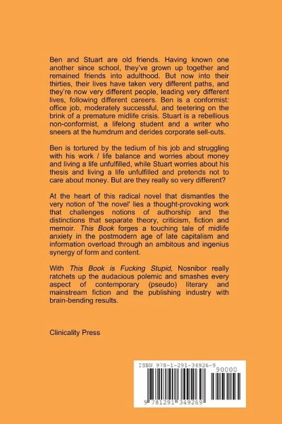 Ben and Stuart are old friends. Having known one another since school, they've grown up together and remained friends into adulthood. But now into their thirties, their lives have taken very different paths, and they're now very different people, leading very different lives, following different careers. Ben is a conformist: office job, moderately successful, and teetering on the brink of a premature midlife crisis. Stuart is a rebellious non-conformist, a lifelong student and a writer who sneers at the humdrum and derides corporate sell-outs. At the heart of this radical novel that dismantles the very notion of 'the novel' lies a thought-provoking work that challenges notions of authorship and the distinctions that separate theory, criticism, fiction and memoir, there lies a touching tale of midlife anxiety in the postmodern age of late capitalism and information overload.