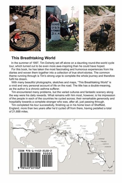 In the summer of 1997, Tim Doherty set off alone on a daunting round-the-world cycle tour, which turned out to be even more awe-inspiring than he could have hoped. For this book, he has taken the most fascinating and humorous experiences from his diaries and woven them together into a collection of true short-stories. With many beautiful photographs, sketches and maps, "This Breathtaking World" is a vivid and very personal account of life on the road. The title has a double-meaning, as the author is a chronic asthma sufferer. Tim encountered many problems, but the varied cultures and fantastic scenery along the way were his daily rewards. What remains with him most, however, is his impression of the people in each of the countries he cycled across; their remarkable generosity and hospitality. Tim completed his tour successfully, finishing up in his home town of Sheffield, England, more than two years after he'd cycled off from there, having pedalled a total of 21,688 miles.