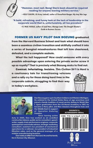 Former US Navy pilot Dan Bozung graduated from the Harvard Business School and took what should have been a seamless civilian transition and skillfully crafted it into a series of bungled misadventures that left him chastened, defeated, and a complete asshole. What the hell happened? How could someone with every possible advantage upon entering the private sector screw it up so royally? That is precisely what Bozung seeks to find out. Comical. Infuriating. Incisive. This Civilian Sh*t Is Hard is a cautionary tale for transitioning veterans and a rally cry for those doing hard time in the corporate cubicle, struggling to find their way in today's workplace.