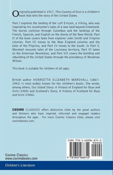 Originally published in 1917, This Country of Ours is a children's book that tells the story of the United States. Part I explores the landing of the Leif Ericson, a Viking, who was inspired by his countrymen's tales of a new land beyond Greenland. The stories continue through Columbus and the landings of the French, Spanish, and English on the shores of the New World. Part II of the book covers tales from explorer John Smith and Virginia colonies. Part III moves to the New England colonies and the tales of the Pilgrims, and Part IV moves to the South. In Part V, Marshall recounts tales of the Louisiana territory, Part VI takes on the American Revolution, and Part VII covers the building and rebuilding of the United States through the presidency of Woodrow Wilson. This book is suitable for children of all ages. British author HENRIETTA ELIZABETH MARSHALL (1867-1941) is most widely known for her children's books. She wrote, among others, Our Island Story: A History of England for Boys and Girls (1905) and Scotland's Story: A History of Scotland for Boys and Girls (1906).