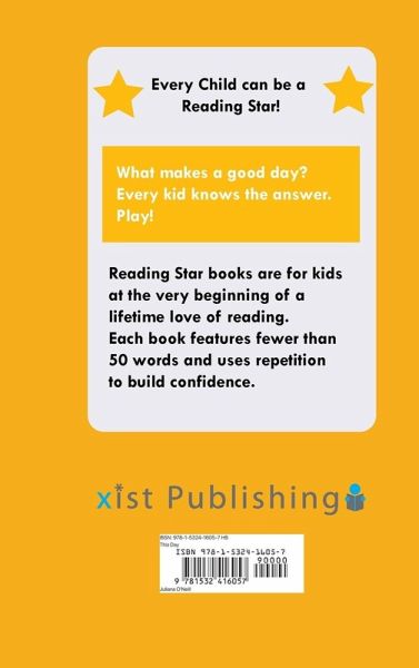 Every Child Can be a Reading Star This is a good day! In this simple rhyming book featuring sight words, a child describes what makes a good day. Play! What makes a good day for you? This Day is part of the Reading Stars series. Reading Star books are for kids at the very beginning of a lifetime love of reading. Each book features fewer than 50 words and uses repetition to build confidence. This Day features the following sight words: a, be, day, done, filled, fun, good, have, is, It, makes, one, play, sun, talks, This, time, to, walks, was, What, will, with