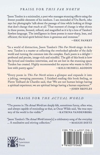 Jason Tandon is a minimalist, a poet who manages stunning effects using the fewest possible elements of his medium. I am reminded of Uta Barth, who says her photographs "talk about the passage of time while looking at things that don't change that much at all." That moment of change is what shines in these poems, focused, refined, and magnified as it is by a lens of Tandon's flawless language. The intelligence in these poems is razor-sharp, lean, and efficient; the kind spirit behind them is generous and immense. -Eric Pankey In a world of distraction, Jason Tandon's This Far North sings: be here now. Tandon is a master at collecting the overlooked splendor of the daily world and turning the common into the complex. Each poem is a delight-profound and precise, image-rich and mindful, with humor weaving its way through as well. The gift of this book is how the lyrical and timeless intertwine, and we are lost in this stunning space Tandon has created. Highly recommended for anyone who wants to fall in love with poetry again. -Kelli Russell Agodon Every poem in This Far North seizes a glimpse and expands it into a jolting, sweeping panorama. I finished reading this book feeling, as Pierre Teilhard de Chardin said, that "We are not human beings having a spiritual experience; we are spiritual beings having a human experience." -John Skoyles